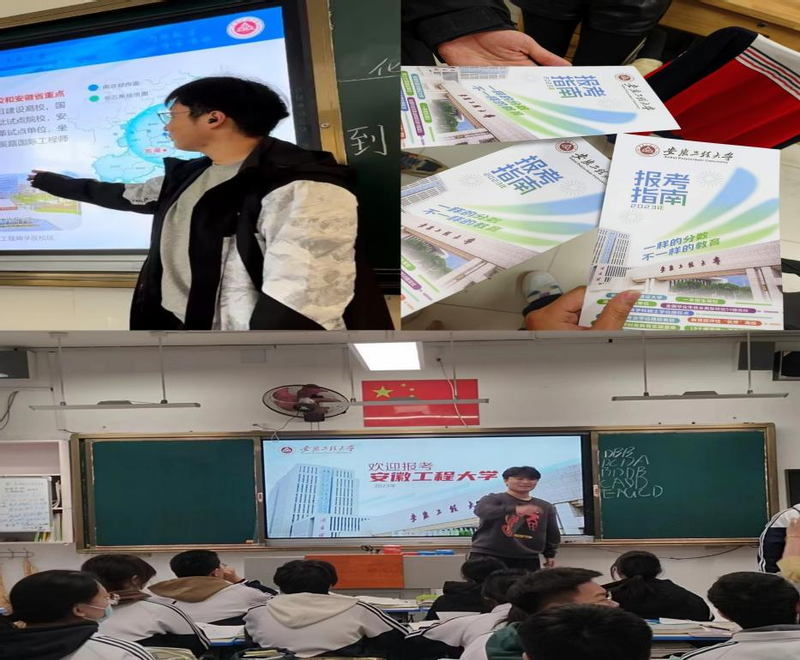 材控231班唐辉宇团队分别去往安徽省阜南实验中学、江西省玉山一中、安徽省临泉一中进行宣传。他们向现场的学弟学妹及家长们发放安徽工程大学的报考指南,介绍学科专业情况,耐心地解答着学弟学们有关学习、生活的疑问,并鼓励学弟学妹们认真备考,争取早日考入理想的大学。