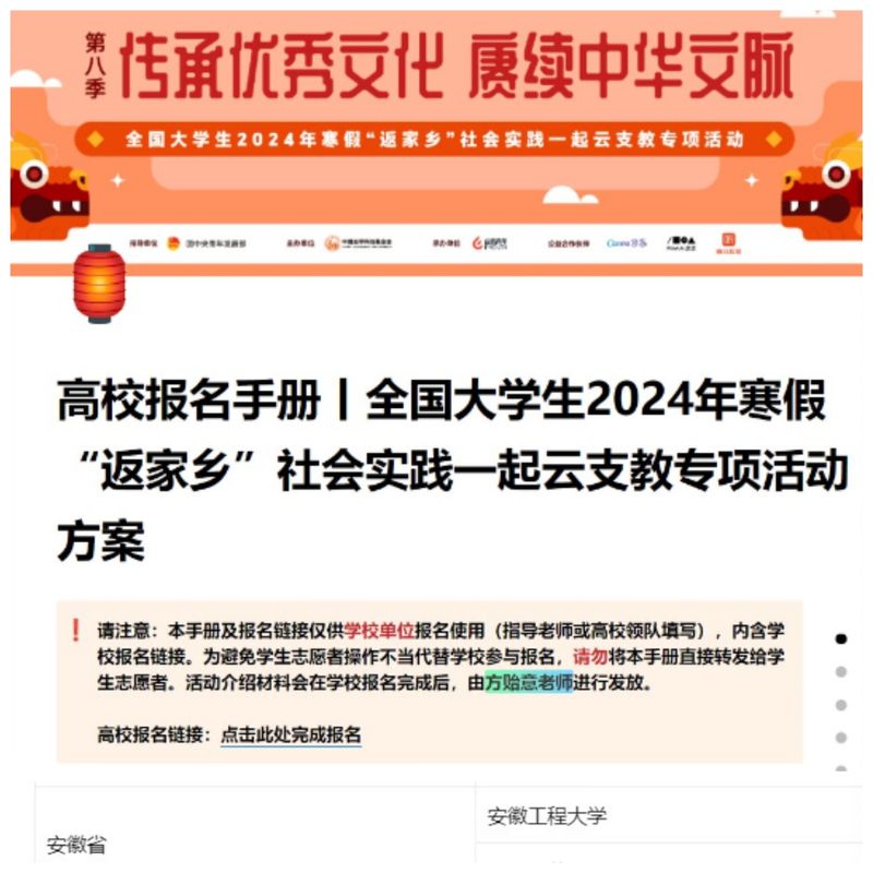 为深入贯彻落实习近平总书记关于少年儿童和少先队工作及青年工作的重要论述精神,1月26日至2月25日,我校星火义务支教社践行“三全六专”教育实践,积极组织参加由共青团中央青年发展部指导,中国光华科技基金会主办的“传承优秀文化,赓续红色血脉”全国大学生2024年寒假“返家乡”社会实践一起云支教第八季专项活动。