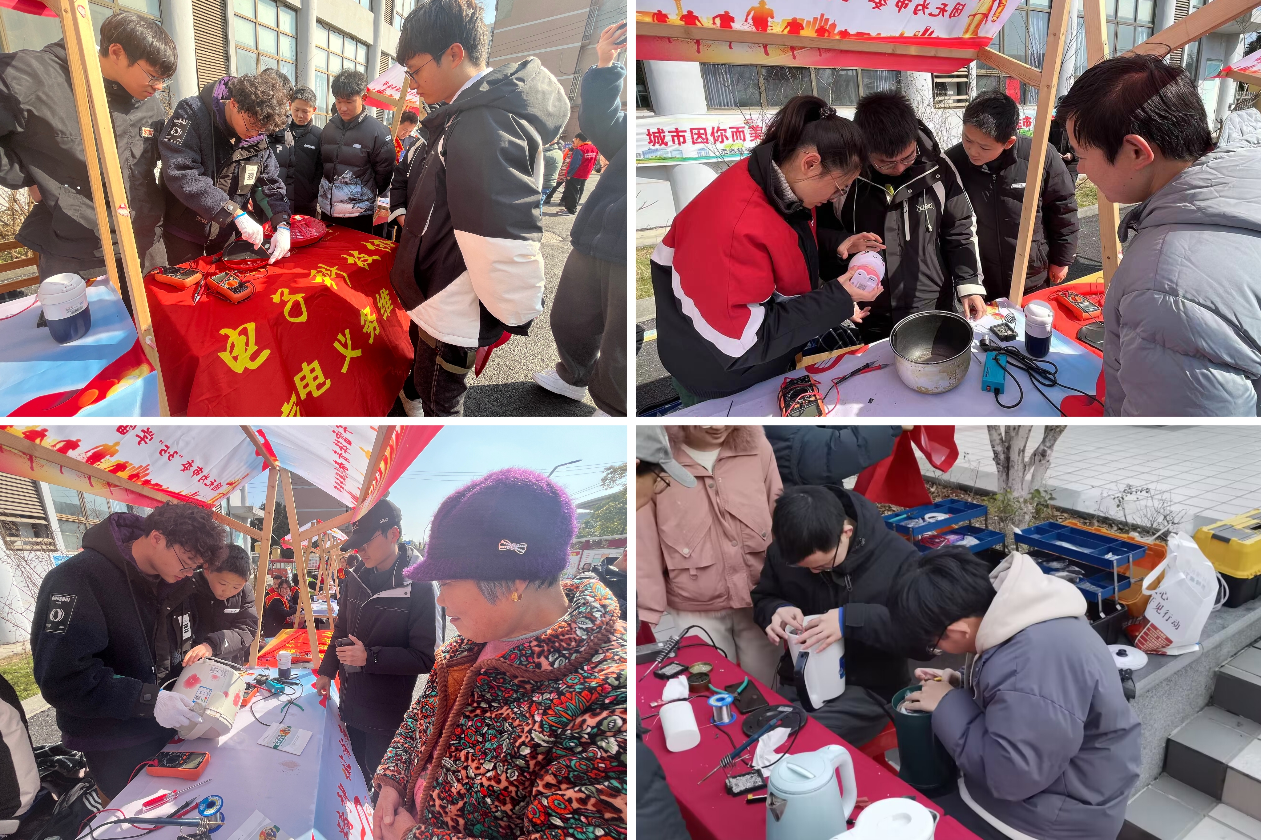 在社区,20余名志愿者在广场上,与社区志愿者一起搭线、布置维修服务台。“同学,这个电饭煲不工作了,你能帮我看看吗。”“这个取暖器用不了了,麻烦给看看。”……刚摆好服务台,前来求助与咨询的居民已络绎不绝,志愿者们立即投入到紧张繁忙的维修工作中。