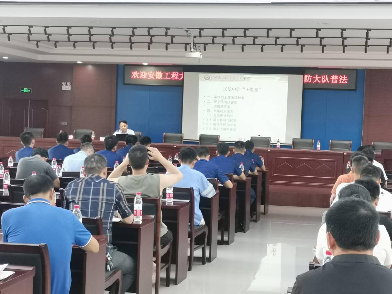 在铜陵市经济开发区消防大队,人文学院王存胜、邵志超两位老师为消防大队官兵及铜陵经开区企事业单位的消防工作人员开展了题为《民法典中的“正能量”》《习近平法治思想的核心要义及其重大意义》两场专题讲座,普法师生与消防大队官兵以《中华人民共和国消防法》《中华人民共和国突发事件应对法》等的贯彻和落实进行了座谈和交流,并共同学习了《习近平与大学生朋友们》(第二卷)的相关内容。