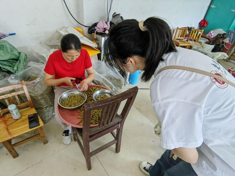 太阳实践队探访的第一站是六茗堂林农科技开发有限公司,这是一家以生产加工售卖霍山石斛为业务的公司。霍山石斛,被誉为“中华仙草”,是一种珍贵的中药材。队员了解到霍山石斛产业经历了从濒危物种到规模化种植的转变,现已成为当地乡村振兴和农民致富的主导产业。公司规模不大,石斛加工方式为人工和机器相结合,这体现了对石斛生产工艺的传承与创新,同时也带动了乡村留守人员的就业,解决了部分村民的工作问题。