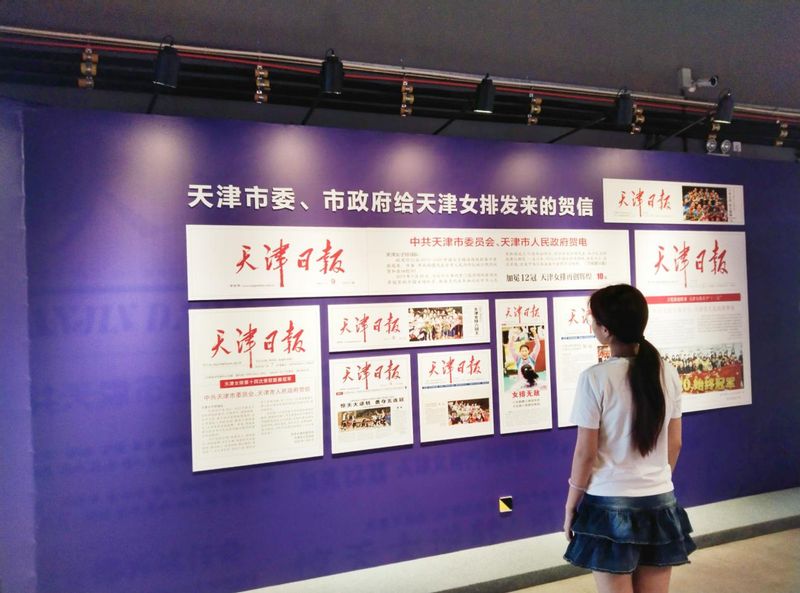 映入眼帘的是天津女排自1956年成立以来的慢慢长征路,随着图片由灰白逐渐添上色彩,队伍也不断壮大发展。实践团成员在与场馆内解说员交流中了解到,天津女排贯彻“全面、准确、快速、多变”的战术指导思想,铸就了“锐意进取、迎难而上、顽强拼搏、争创第一”的天津女排精神。团队成员也在调研中更深入了解女排精神、奥运精神,将奥运精神融于文明之旅实践中。