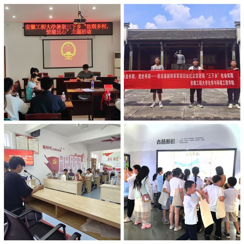 学院“法情乡韵”模拟法庭三下乡团队入选“法治中国青春行”2024年全国大学生“三下乡”暑期社会实践专项活动,社会实践团队赴广德市誓节镇,成员在当地进行了法律问卷调研,联合当地团委开展“法润乡村,情暖民心”普法系列社会实践活动;“科技引领,梦想启航”项目团队联合无锡市江阴香樟树志愿者服务队带领小营员们参观了江阴生态环境局大气环境质量自动监测站、江阴城市记忆馆,为训练营成员深入讲解城市文化;实践团队赴弋江区元山社区党群服务中心了解基层社区居民需求困惑并协助社区工作人员组织开展法制讲座公益活动,增强社区群众的法律意识,降低电信诈骗风险;学院“青年说信仰,理论耀光辉”宣讲团赴安徽省阜南县席老家村开展理论宣讲活动,将党的好声音、好政策传到人民群众的心坎上,为乡村振兴贡献绵薄之力。