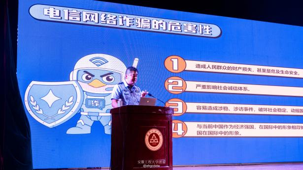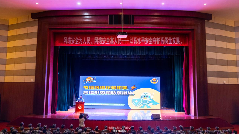 9月18日晚,校团委联合团芜湖市委邀请芜湖市公安局刑警支队二级警长汪欣走进学校师生活动中心大礼堂,开展了以“筑牢反诈防线 守护青春梦想”为主题的反电诈宣传教育讲座,吸引了1000余名2025级新生参与。
