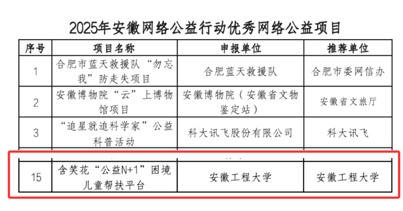 9月22日,安徽省委网信办在安徽省美术馆召开“网聚爱心·益动安徽”2025年安徽网络公益行动优秀项目发布暨交流会,对全省15项具有代表性、示范性和影响力的公益项目予以表扬。材料科学与工程学院“含笑花‘公益N+1’困境儿童帮扶平台”成功入选,也是安徽省教育系统唯一入选的项目。