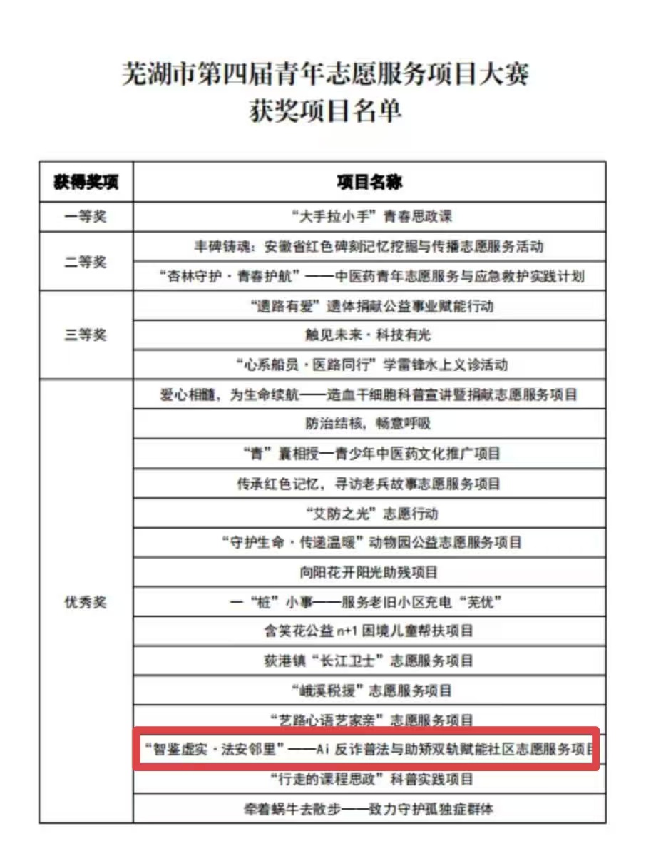 近日,芜湖市第四届青年志愿服务项目大赛决赛暨青年志愿服务交流活动在苏宁环球大酒店圆满结束。本次大赛由团市委、市青年志愿者协会联合市委社会工作部、市民政局、市志愿者协会、市社会工作(者)协会共同主办,自今年7月启动以来,共吸引全市近100个项目申报,覆盖乡村振兴、为老服务等14个领域。经多轮评审,共37个兼具创新性与实效性的优秀项目入围决赛。“阳光之旅”青年志愿者服务队所申报“智鉴虚实·法安邻里”——AI反诈普法与助矫双轨赋能社区志愿服务项目成功晋级决赛并荣获“优秀奖”。