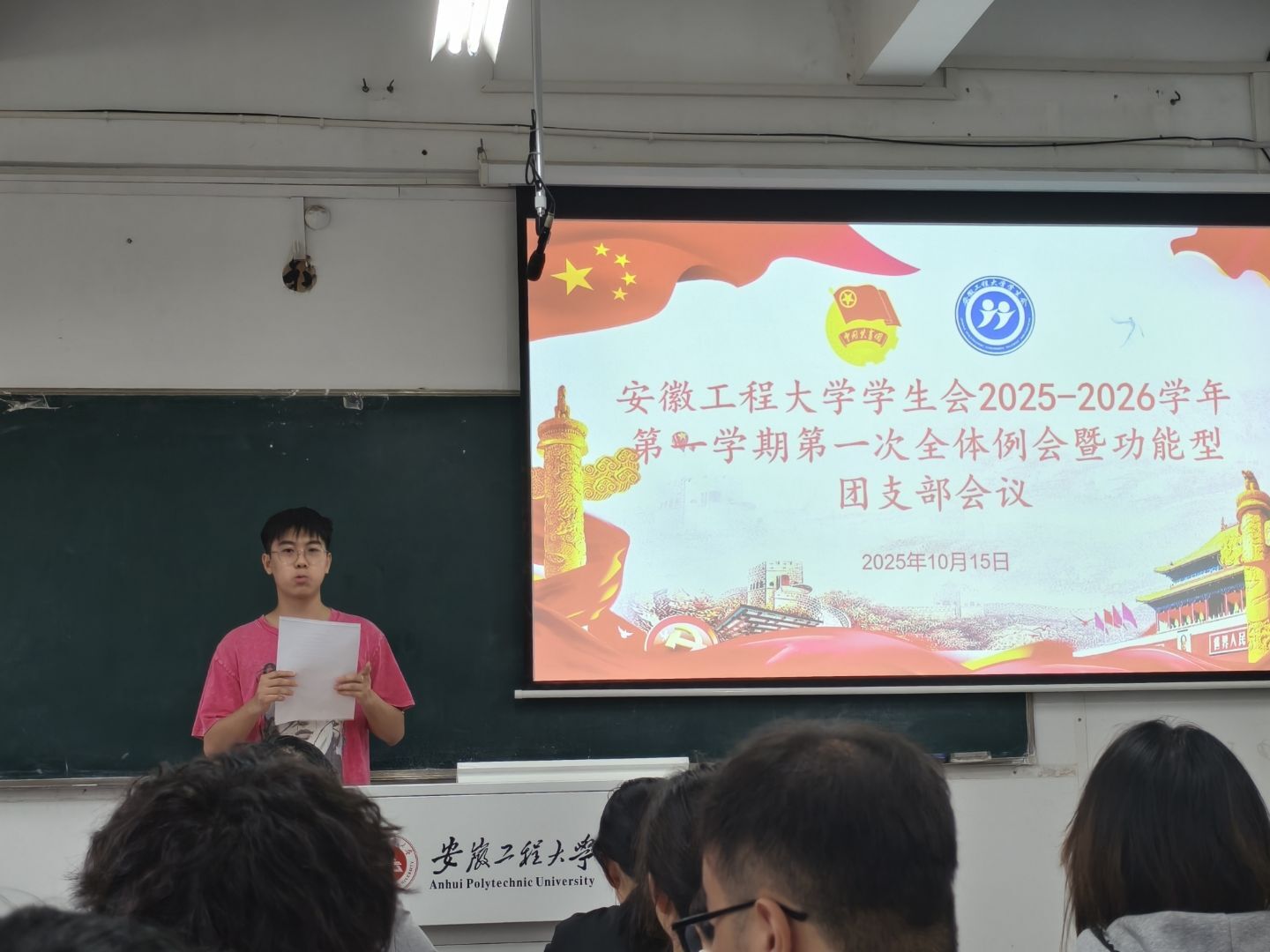 10⽉15⽇下午,校学生会在5教104教室召开2025-2026学年第⼀学期第⼀次全体例会暨功能型团⽀部会议。校学⽣会秘书⻓孙琳瑶、团委组织宣传科科⻓王海明及学生会全体成员参加会议,会议由校学⽣会主席刘昌涛主持。