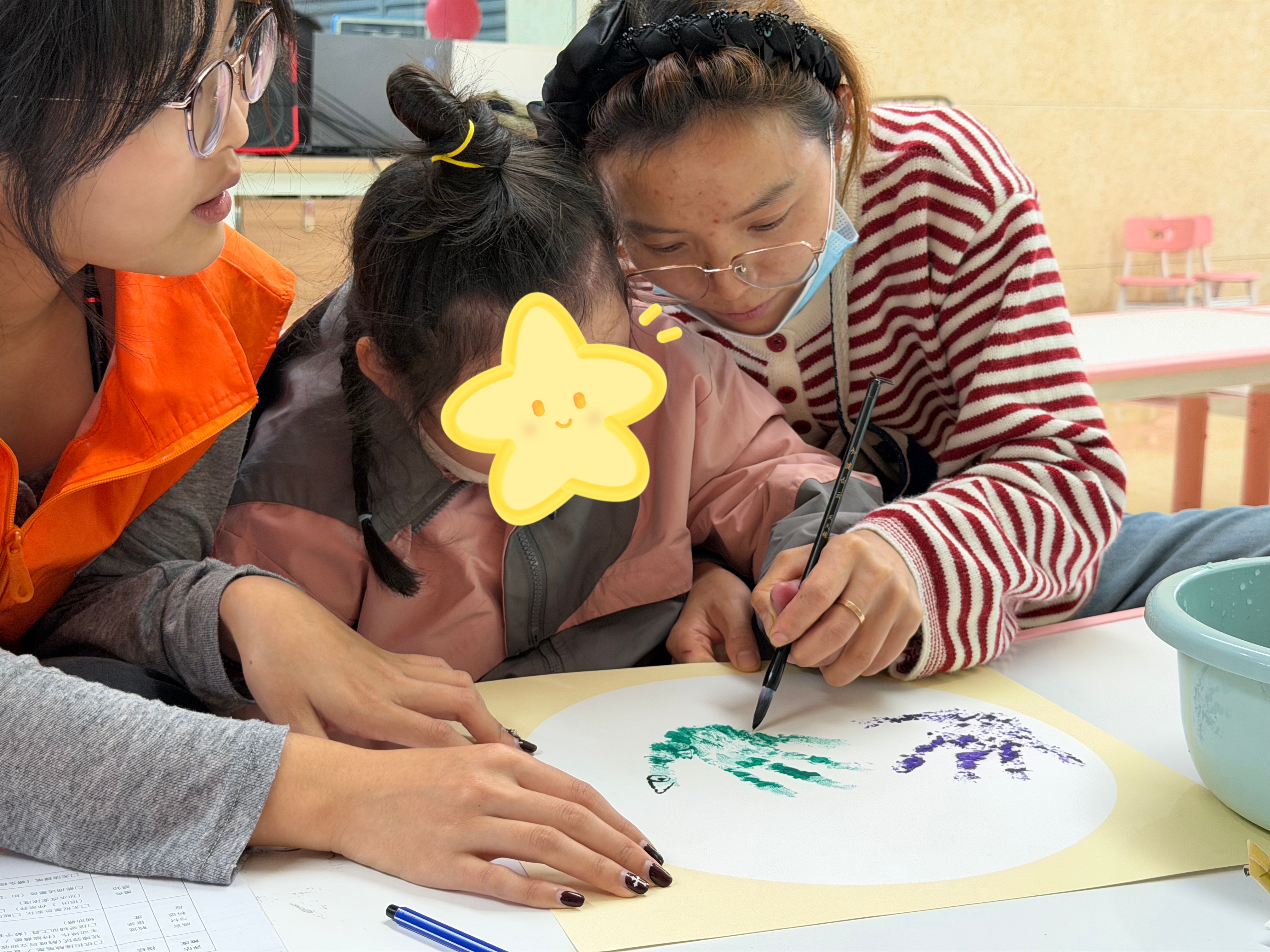 活动伊始,设计学院的志愿者们提前来到现场,精心布置创作空间。他们将素雅的宣纸平整铺开,一旁摆放着精心调配的墨汁与国画颜料,以专业且温馨的环境引导孩子们步入水墨丹青的世界。志愿者们耐心地向孩子们介绍笔、墨、纸的特性,如何利用水的晕染创造浓淡干湿的丰富层次。
