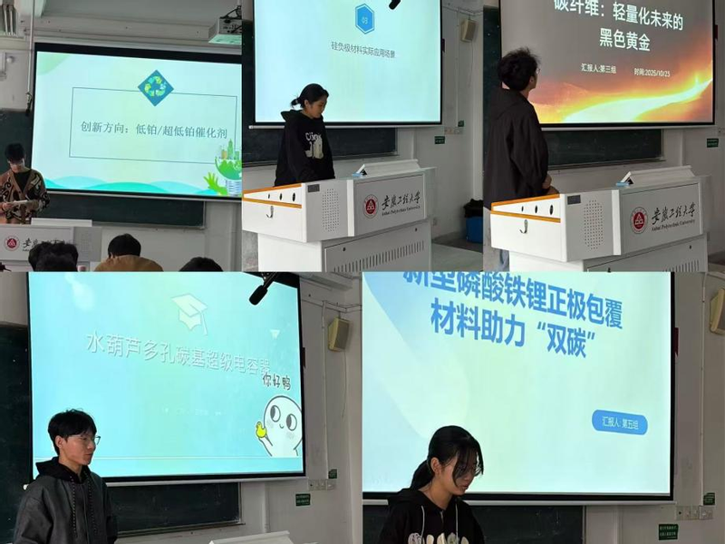 随后,班级五个学习小组依次登台展示阶段性研究成果,一场兼具专业性与思想性的案例分享会正式展开。第一组代表童好以“氢燃料电池催化剂材料创新”为切入点,从材料微观结构切入,系统解析了催化剂性能优化对提升燃料电池能效、降低碳排放的核心作用;第二组代表陈佳宁聚焦“硅负极材料提升锂电池能量密度”,结合新能源汽车产业减排需求,具象化阐述了该技术突破对推动交通领域低碳转型的实际价值;第三组代表吴健辉带来“碳纤维:轻量化未来的黑色黄金”专题分享,通过多场景数据对比,深入分析了其在汽车、航空领域的减重减碳潜力;第四组代表白城毓以“水葫芦多孔碳基超级电容器”为研究对象,创新呈现了环保材料循环利用的技术路径与生态价值;第五组代表万怡君围绕 “新型磷酸铁锂正极包裹材料”展开,从性能提升与低碳发展双维度,剖析了该材料对优化电池循环寿命、降低生产能耗的双重增益。各小组均紧扣 “双碳” 主题,从技术研发背景、实际应用场景、量化减碳效果及未来发展趋势等维度实证分析,充分展现了新能源材料专业学子的专业素养与创新思维。