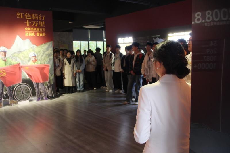 走进红色骑迹馆,“中国当代徐霞客”赵国庆、曹锦芬的骑行事迹展区成为焦点,大家认真聆听讲解员介绍他们以骑行丈量祖国大地、传播红色文化的故事,那幅绘有骑行者与国旗的展示板,让同学们直观感受到了用脚步践行信仰的赤诚。在发光的中国地图前,学员们循着“红色骑迹”的时空脉络深入学习:从革命战争年代青年热血报国的壮举,到新时代骑行者在祖国边疆传递使命的坚守,骑行路线背后的红色故事让每一段历程都变得鲜活可感。