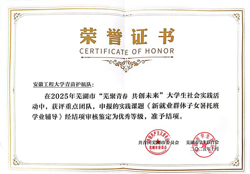 近日,2025年芜湖市“芜聚青春 共创未来” 大学生社会实践活动终评结果出炉,由范广伟、苑雨露老师指导的“青苗护航”社会实践团队获评重点团队,申报的实践课题《新就业群体子女暑托班学业辅导》获评优秀等级。