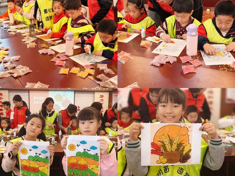 巧手共绘丰年,构筑家园图景。在手工实践部分,支部成员们与社区小朋友们结对协作,共同投入“丰收长卷”的集体创作。孩子们在支部成员的启发与帮助下,运用彩纸、谷物、胶水等综合材料,通过拼贴、绘制、塑形等方式,在画布上呈现出稻田翻滚、瓜果满枝的秋日盛景。一幅幅生动饱满的画面不仅展现了孩子们对“丰收”的独特理解,更在合作中传递出珍惜粮食、感恩自然的价值理念。