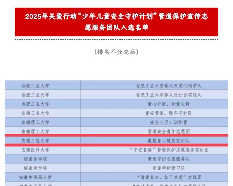 近日,团中央公布了2025年关爱行动“少年儿童安全守护计划”管道保护宣传志愿服务团队遴选结果,我院志愿团队成功入选。