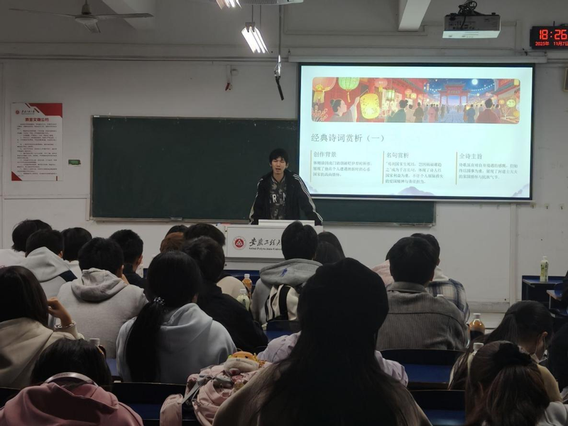 为纪念中国人民抗日战争暨世界反法西斯战争胜利80周年,传承红色基因,弘扬中华优秀传统文化,11月18日晚,由校大学生社团管理中心主办、建筑工程学院子衿诗社承办的“冬日诗韵·家国情深”主题团日活动在5J101教室温情启幕。40余名诗社成员齐聚一堂,以“诗词速配”破冰互动点燃现场,在卡片传递与吟诵相和中打破隔阂、凝聚共识。