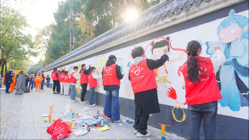 在推进教育部“立德树人”综合改革试点院系建设进程中,学院将志愿服务、专业实践与城市发展深度融合,学子们从装点一面墙到温暖一座城,以青春色彩参与城市叙事,以专业能力服务地方文化建设,实现了知识传授、能力培养与价值引领的有机统一。在这幅日益生动的“金色画卷”中,可以看到的不仅是传统文化的当代绽放,更是一座城市与青年一代的双向奔赴。当青春创意融入城市发展,每一面墙都会说话,每一个街角都在生长希望。这座正在崛起的省域副中心城市,也因“向阳花”留住城市美好瞬间志愿服务团队的笔墨,增添了一抹立德树人的青春印记。