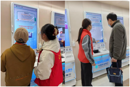 活动之前,医院专业医护人员为志愿者们进行了系统岗前培训,内容涵盖自助设备操作全流程、常见突发问题处置及规范就医引导礼仪,确保了志愿服务的专业性与高效性。服务期间,志愿者们分守在医院门诊大厅的自助挂号机、缴费终端等重点区域,主动上前、耐心答疑。他们不仅“手把手”地协助患者完成从挂号、缴费到打印票据的每一步操作,还积极协助院方疏导人流、维持秩序,有效缩短了窗口排队时间,提升了整体就医效率。