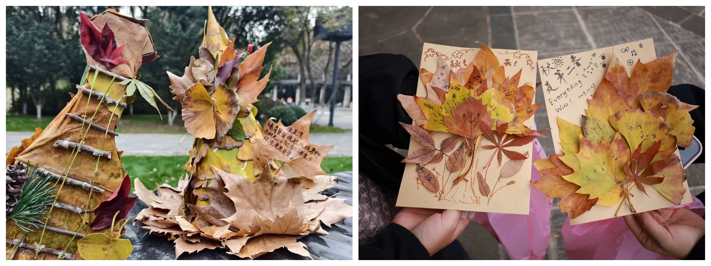 活动中,步道与草坪成“创意宝藏库”。同学们或独自寻觅独特落叶,或结伴观察纹理、收集银杏、红枫等。回到集合点,手作环节热闹非凡,有人拼贴出“神山秋之精灵”贴画,有人编织落叶花环并点缀野果。完成作品后,大家分享灵感、打卡抽奖,精美礼品和贴纸带来双重喜悦。
