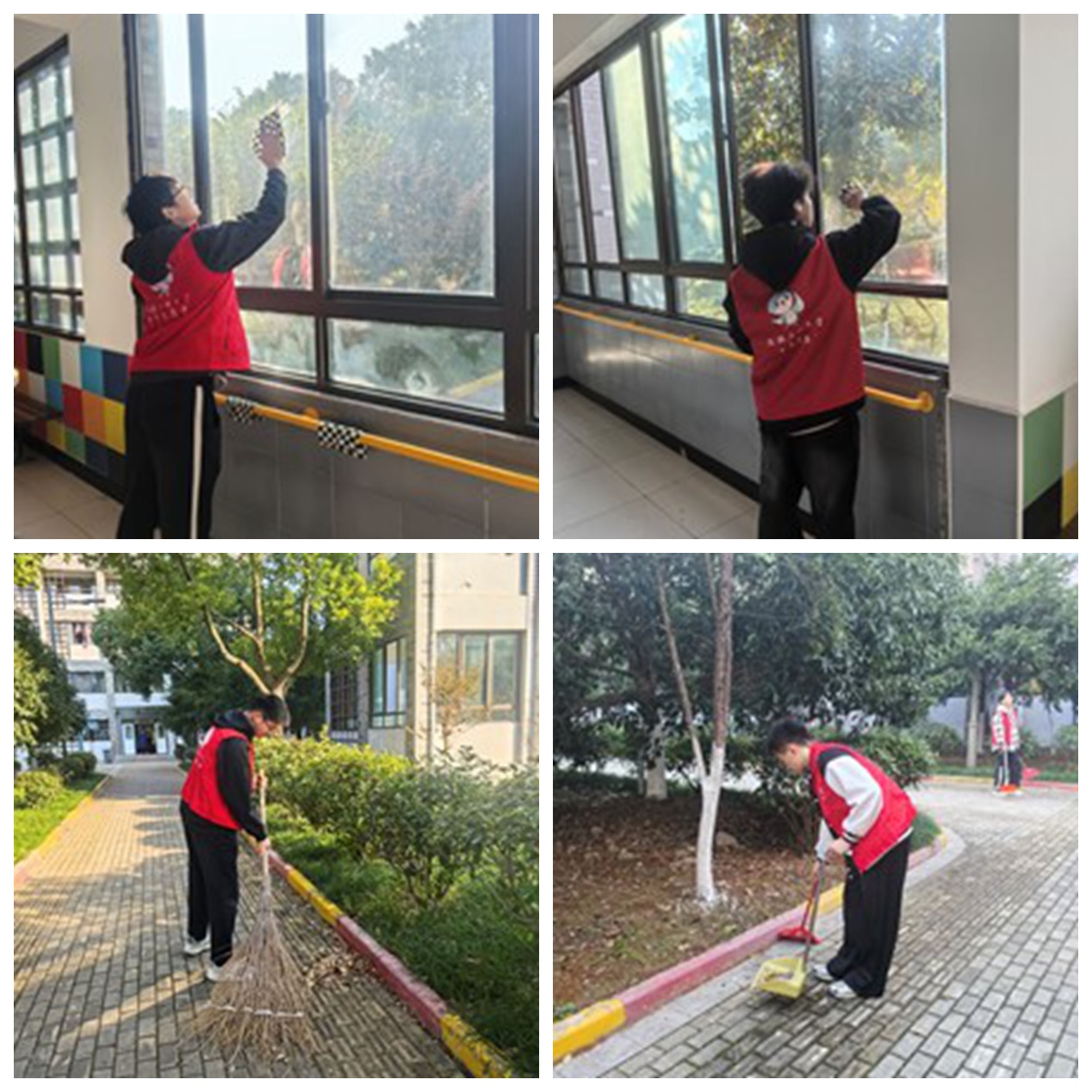 身着红色志愿马甲的志愿者们分工明确、干劲十足。大家手持扫帚、抹布等工具,细致清理校园步道的落叶与杂物,不放过绿化带边缘的细小垃圾;认真擦拭教学楼走廊的窗户与栏杆,让阳光透过洁净的玻璃洒满室内每个角落。从户外公共区域到室内活动空间,志愿者们用耐心与细心打理校园的每一处,用实际行动传递着对特殊群体的关爱与尊重。