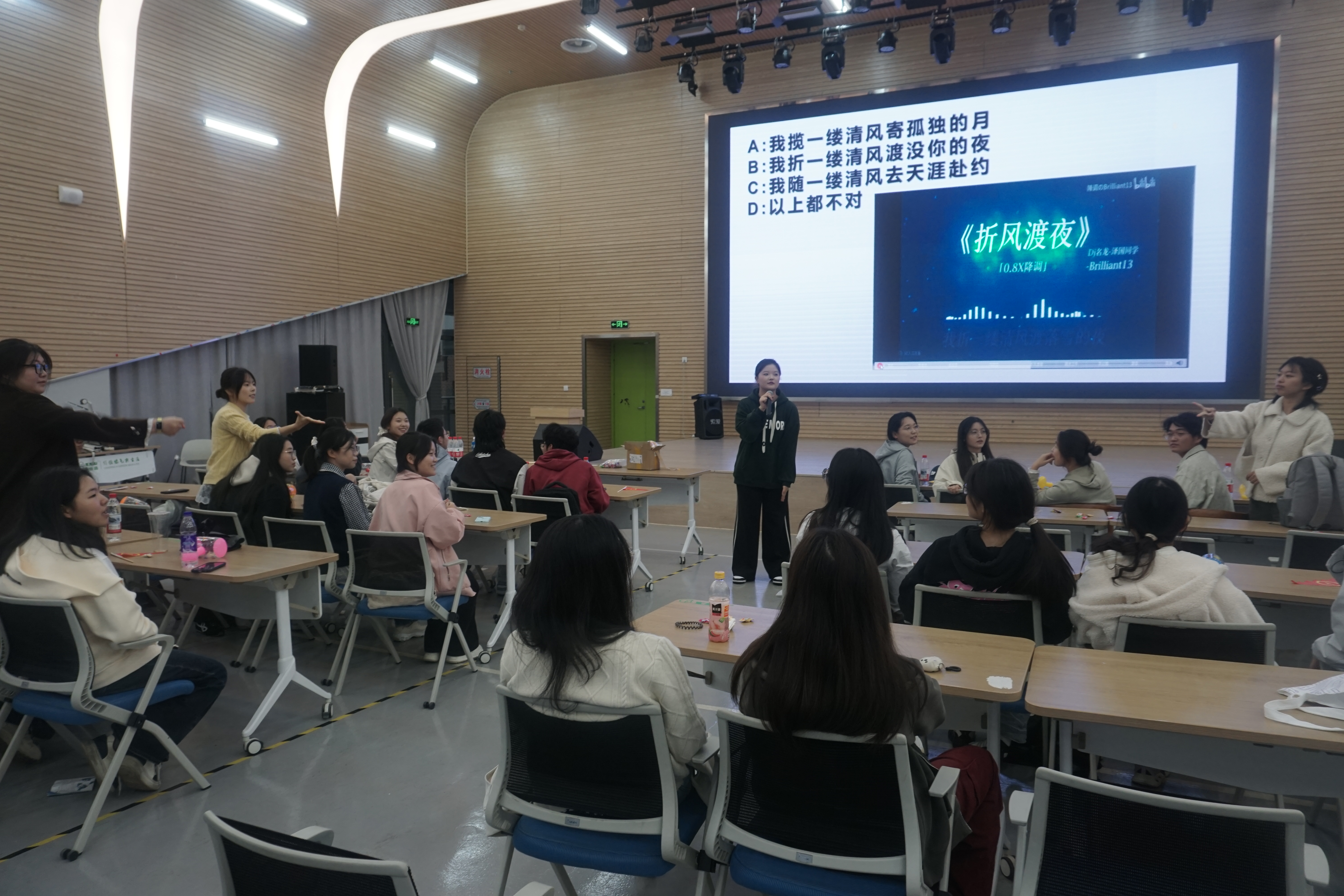 猜词刚结束,歌词又起!“歌词接龙”环节直接将挑战升级。参与者组成几个小组,从经典到流行,一句句歌词在紧张刺激的抢答中穿梭。“下一句是什么来着?”有的同学抓耳挠腮,急得面红耳赤;有的则从容不迫,选项张口就来,展现“中华小曲库”的深厚功力。现场时而屏息凝神,时而爆发出鼓励的掌声和善意的笑声,小小的抢答歌词接龙游戏,成了展示勇气与默契的绝佳舞台,展示出同学们适应时代生机活力与浓厚的知识储备量。