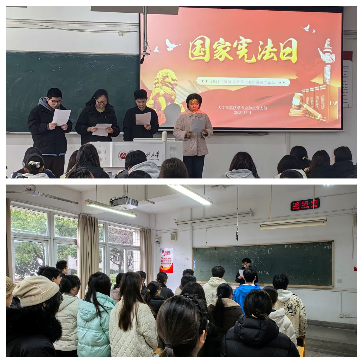 在党员代表和团员代表的领读下,党员、入党积极分子与共青团员们齐声诵读了《中华人民共和国宪法》序言及部分核心条款。“中华人民共和国的一切权力属于人民”“中华人民共和国公民有受教育的权利和义务”……铿锵有力的诵读声回荡在教室中,字句之间传递着宪法的庄严与温度。