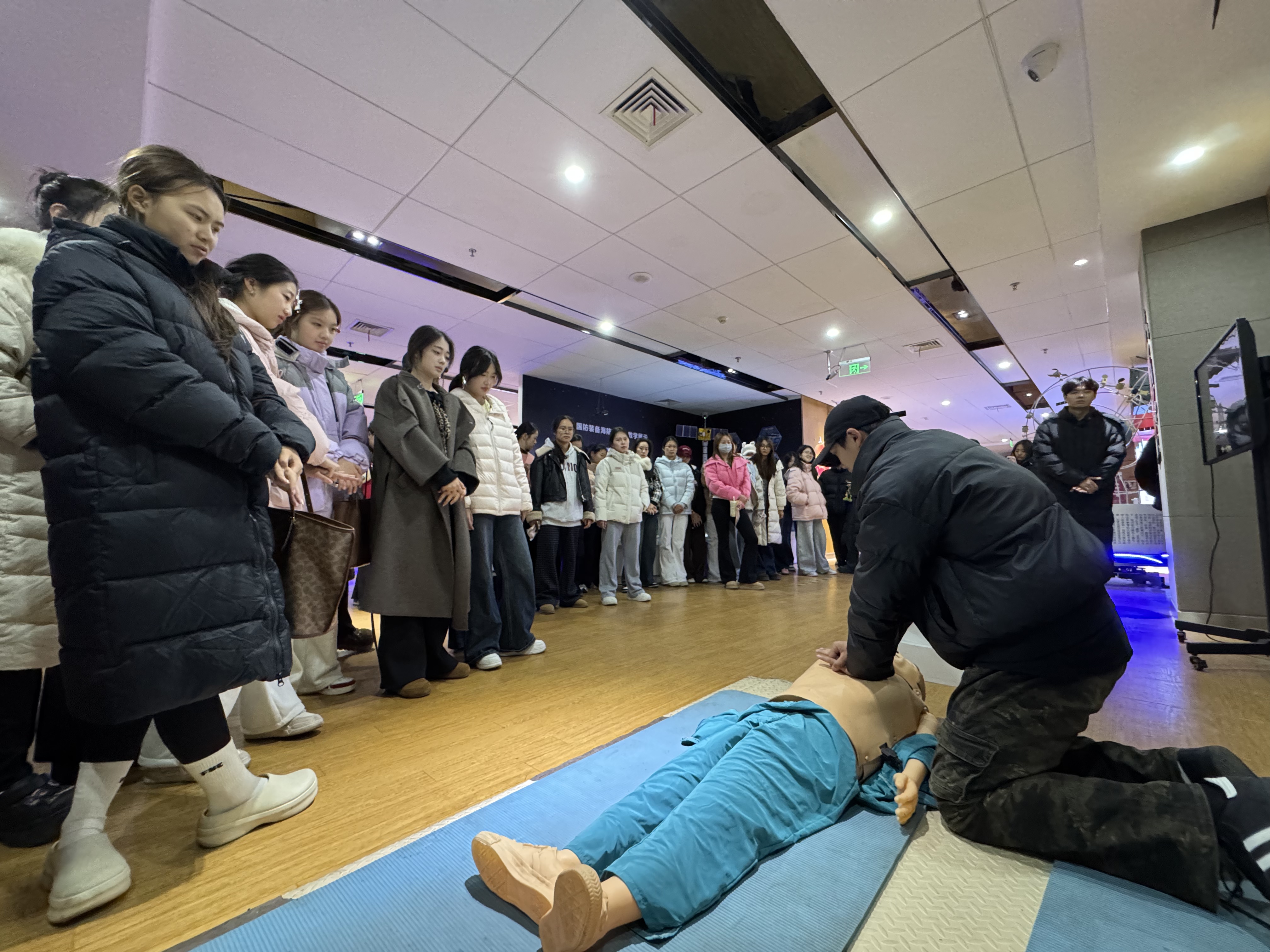 在学校安全教育实验室内,新生们在讲解志愿者的引导下,依次参观了消防安全、急救技能、交通安全、防诈骗宣传等多个主题展示与体验区。实验室综合运用实物展示、模拟场景、互动体验、多媒体演示等现代化教育手段,将抽象的安全知识转化为可感、可操作的生动实践。同学们亲自体验了模拟灭火、烟雾逃生、心肺复苏操作、安全结绳训练等项目,在模拟实操中掌握了紧急情况下的正确应对方法与关键技能。