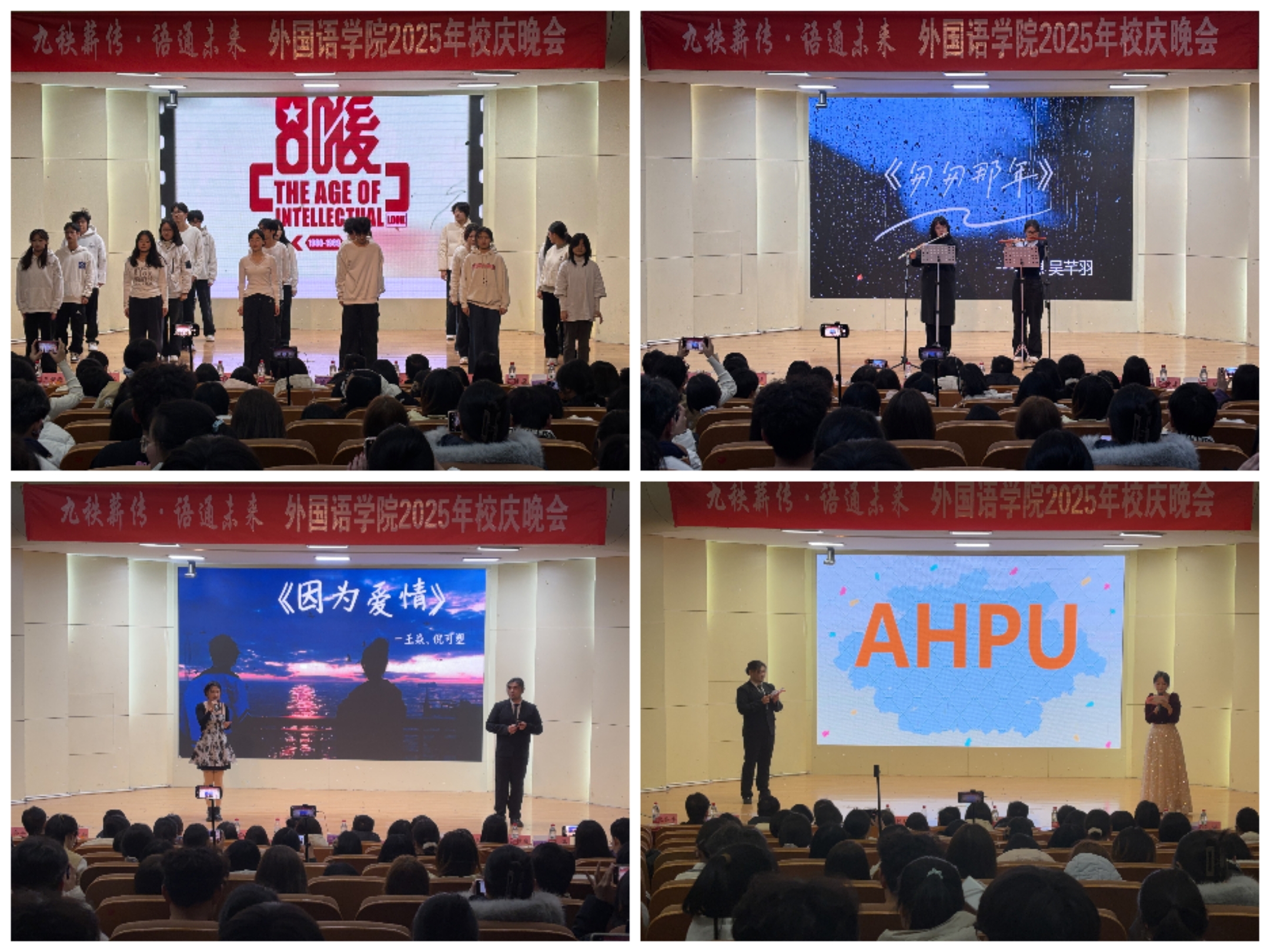 晚会精心设计的“Word Puzzle”互动环节,巧妙融合校庆主题与外语专业特色,让现场气氛持续升温。观众踊跃参与词汇拼写,在“GRATEFUL(感恩)”“HARMONY(和谐)”“CREATE(创造)”“AHPU”等英文词汇的拼接中,既展现了外语素养,更传递了对母校的感恩之心、对校园和谐的向往之情以及对未来创新的追求之志。