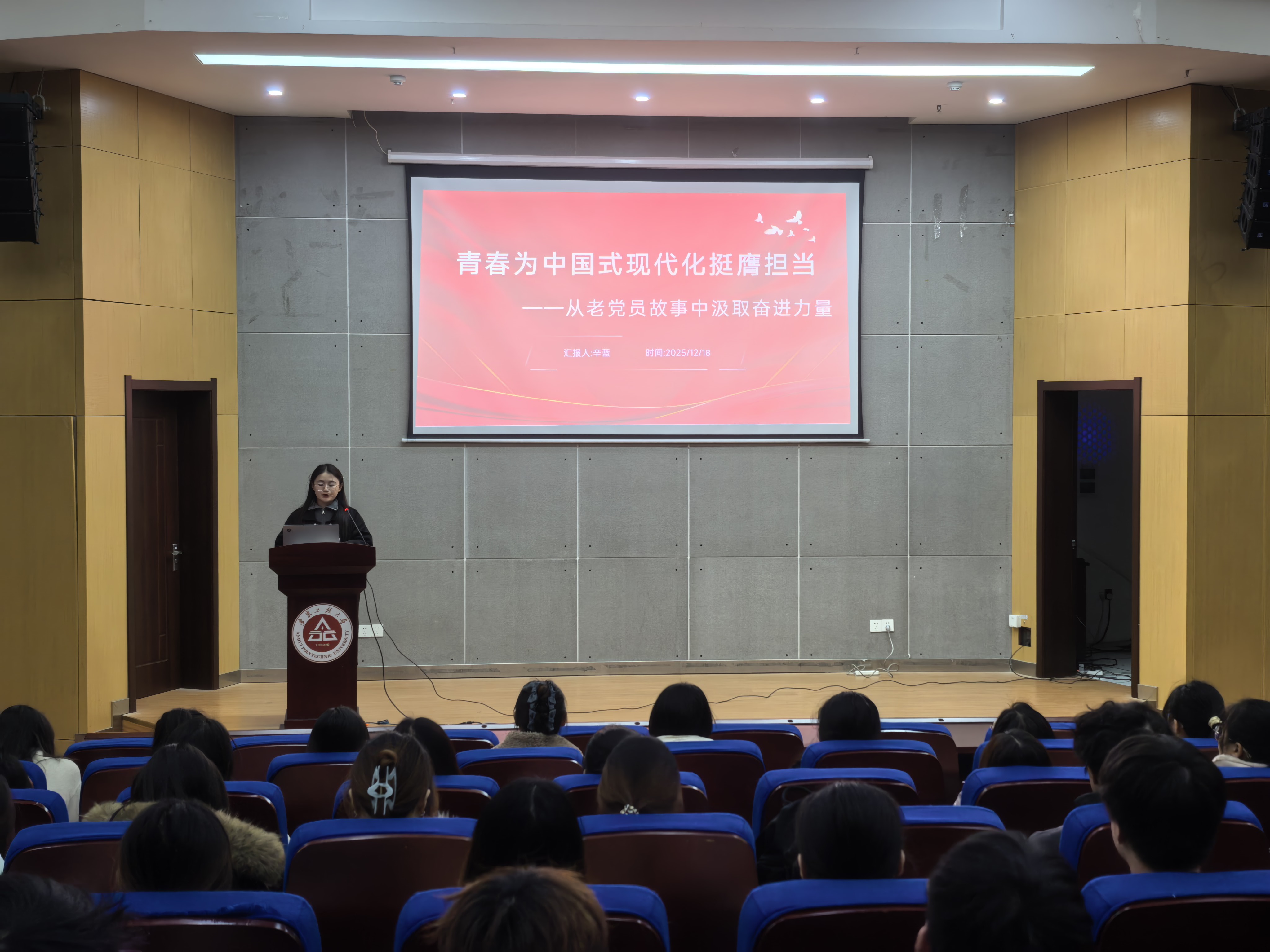 宣誓环节,在物联网242高越洋的领誓下,新团员面向团旗,高举右拳,许下青春誓言:“我志愿加入中国共产主义青年团……”铿锵有力的誓词在厅内回荡,彰显出坚定的信念与担当。新团员代表计算机(拔尖)241班黄相月分享了自己加入共青团的激动心情,她承诺,将时刻以团员标准要求自己,勤学善思、乐于助人、勇担使命,把个人理想融入国家发展与民族复兴伟业中,用奋斗书写无悔青春。最后,学院团委学生兼职副书记、校“十佳宣讲员”物联网 232 班辛蓝开展《从老党员故事中汲取奋进力量》主题宣讲。