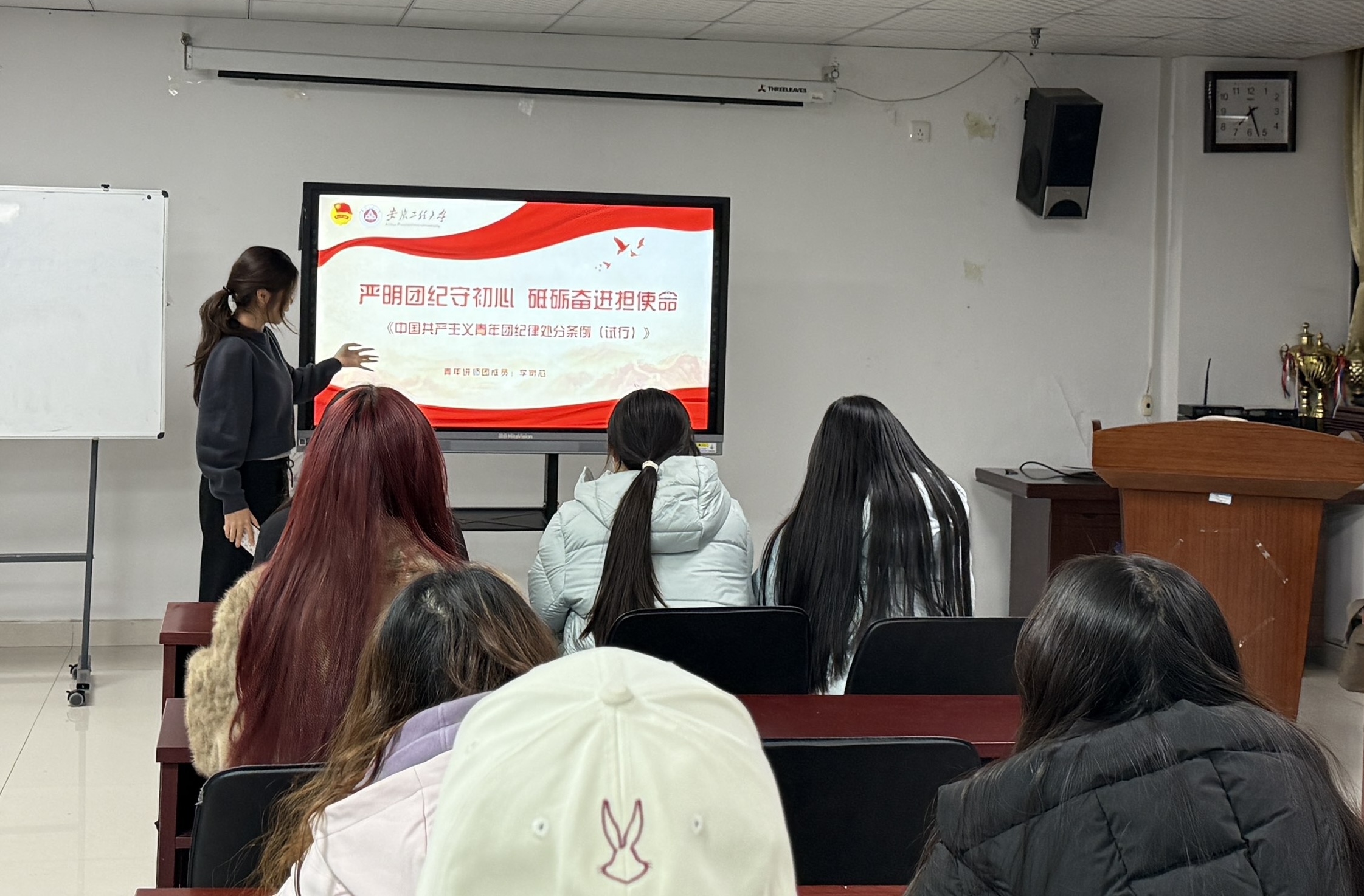 本次宣讲紧扣共青团纪律相关内容,李岢芯同学条理清晰地从总则、违纪与纪律处分、团纪处分运用规则、对违反纪律行为的处分、对违法犯罪团员的团纪处分、附则六个核心板块展开讲解宣讲过程中,她结合生动案例,将严谨的团纪条文转化为通俗易懂的内容,让同学们深刻认识到严守团纪对于团员成长、团组织建设的重要意义。