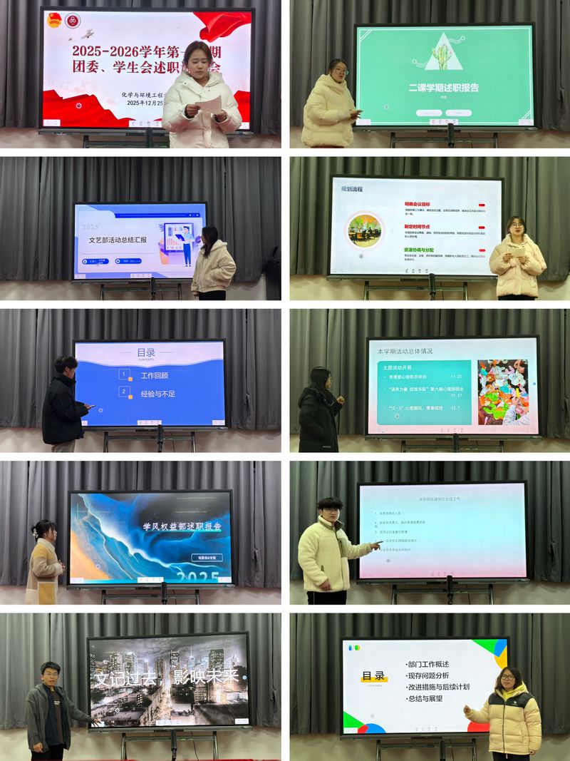 为总结工作实效,服务成长根基,进一步加强团学组织自身建设,激发工作活力,12月25日,化学与环境工程学院在学院学生能力发展中心召开2025-2026学年第一学期团委、学生会述职评议会。学院团委负责人,团委、学生会全体成员,学生代表参加了本次会议。会议由学院团委学生副书记郑雨主持。