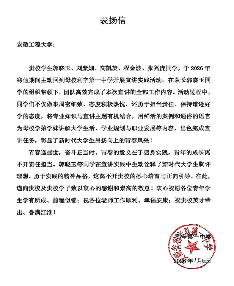1月12日,安徽工程大学机械与汽车工程学院学生志愿服务团队赴亳州市利辛县第一中学开展“2026年寒假志愿服务暨回母校宣讲”活动,旨在通过面对面交流,向中学学子全面介绍安徽工程大学的办学特色、专业优势与人才培养成果,展示学校作为一所以工为主、多学科协调发展的高水平大学的独特魅力,搭建起高中与大学有效衔接的沟通平台,推进“高中高校人才培养一体化”建设。