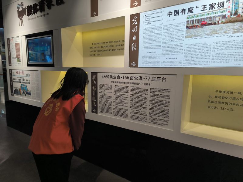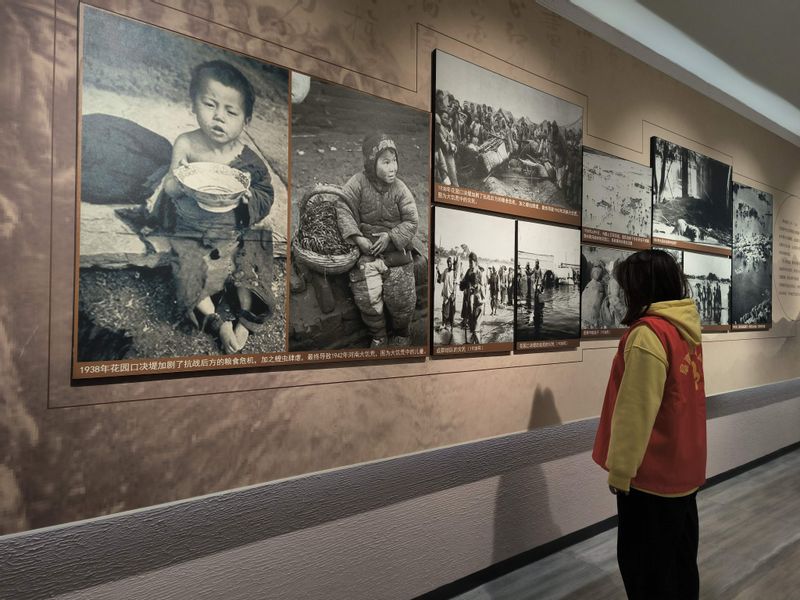 走进王家坝抗洪纪念馆,实践团成员高分子252韩艺玲、高分子251李雅欣同学身着志愿马甲,认真聆听讲解。展厅里,“2860 条生命・166 面党旗・77 座庄台”的醒目标语,与泛黄的老照片、详实的救灾记录相互印证,生动还原了淮河儿女与洪水抗争的悲壮历程。同学们在一幅幅历史影像前驻足凝视,深刻理解“顾全大局、自强不息、同舟共济、科学治水”的王家坝精神内核。