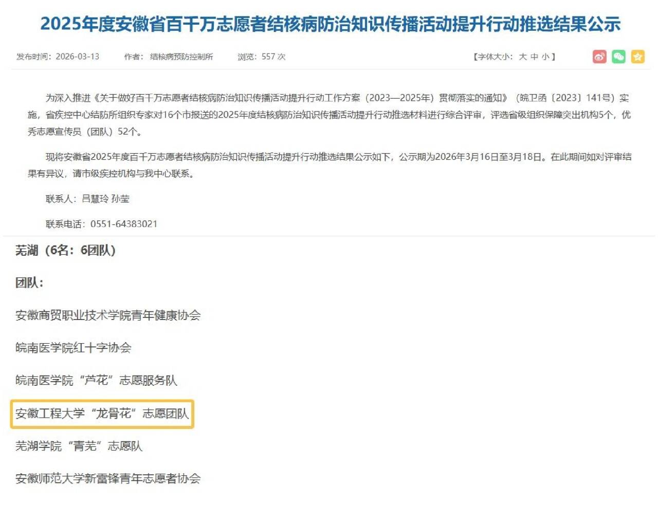 3月16日-18日,2025年度安徽省百千万志愿者结核病防治知识传播活动提升行动推选结果及2026年度志愿者团体培育计划评审结果在安徽省疾病预防控制中心网站公示。我校外国语学院“龙骨花”结核病防治宣传志愿团队获评2025年度优秀志愿者团队称号,并在2026年度志愿者团体培育计划中获得一等资助。