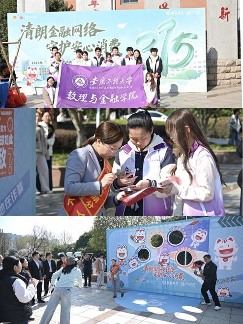 3月13日,学院学子协助共青团芜湖市委、招商银行等单位,在学校“一站式”学生社区青年广场开展“3•15”校园金融反诈宣传活动。依托专业学科优势,活动设立“金融安全咨询台”,一对一解答网贷陷阱、电信诈骗等咨询200余人次;推出“金融反诈闯关游园会”,将“风险识别大富翁”“消费陷阱迷宫”等游戏融入防诈知识,发放定制手册300余份。英语253班曹惠茹参与后表示:“活动让我坚定了拒绝‘校园贷’的决心,金融安全不是空谈,而是可操作的日常。”