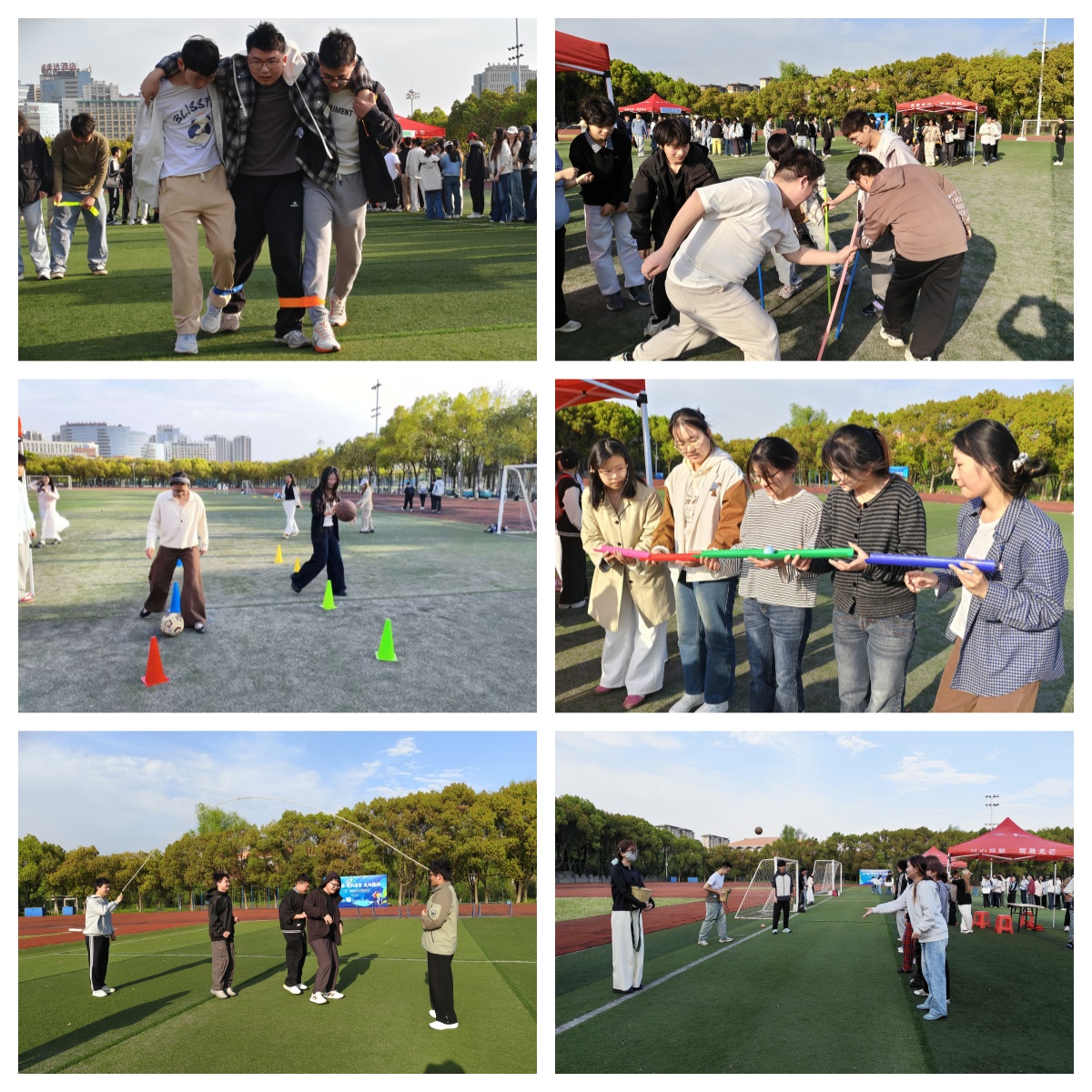 本次活动将团队协作与体育挑战深度融合,现场氛围热烈有序。同学们以五人小组为单位,手持集章卡片,依次参与六个打卡项目。“往返协作”中,相邻组员脚踝相绑,从“两人三足”到“三人四足”接力往返,默契冲向终点;“不倒森林”考验反应与配合,组员围圈持杆,在奔跑换位中保持长杆不倒;“球艺精湛”环节,篮球、足球绕障碍物,羽毛球、乒乓球颠球轮番上演,同学们各展所长;“珠行万里”中,组员用道具接力传递小球,齐心协力送入纸杯;“龙飞虎跳”30秒跳绳接力,组员依次跃入绳中,全力冲击目标次数;“破竹之势”则结合传统蹴鞠投掷与背篓接物,趣味十足。赛场上,每位同学都为团队荣誉全力以赴,处处洋溢着青春活力与温暖力量。国贸251班胡佳绮同学表示:“这次活动让我体会到团队合作的乐趣。整个活动项目设计得非常有趣,尤其是‘不倒森林’环节,大家反复练习才成功,那种彼此配合的感觉很难忘。”