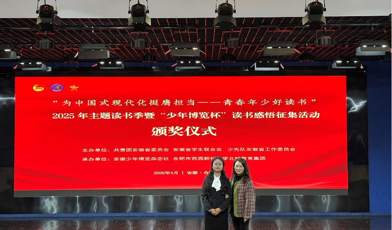 颁奖仪式在合肥举行。我校获奖学生代表化学与环境工程学院应用化学(拔尖)251班吴羽馨,以及指导教师代表人文素质教育中心办公室主任利昕云应邀参加。团省委一级巡视员、省少工委主任李丹云等相关单位负责同志为获奖代表颁奖。当日,主办单位联合安徽少年博览杂志社,还组织获奖单位代表和师生代表实地参观了中国科学技术大学校园、渡江纪念馆(地铁)站“青春年少好读书”微展览以及安徽省科技馆。吴羽馨在领奖后表示:“恰逢全国首个‘全民阅读活动周’,能够代表学校赴合肥领奖,我深感荣幸。对我而言,读书与写作不仅是提升人文素养的重要途径,更在专业学习之外打开了广阔天地。非常感谢学校的培养和老师的悉心指导,这份荣誉将激励我继续以书为伴、笃行不怠。”