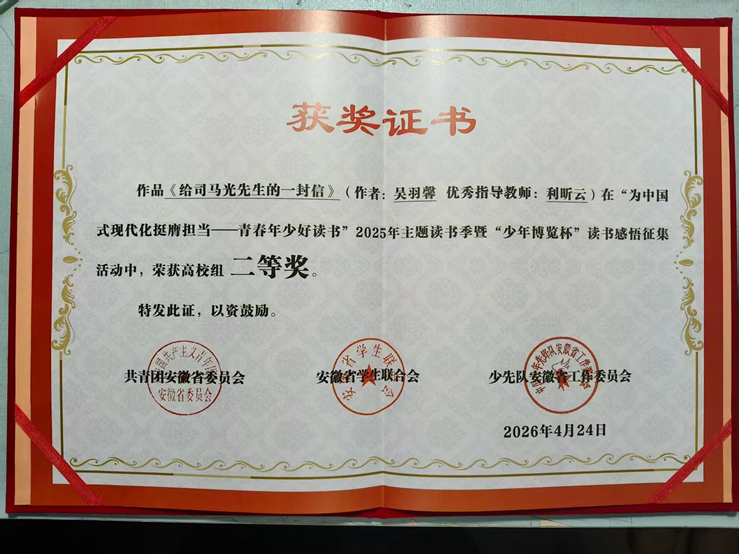 4月24日,由共青团安徽省委员会、安徽省学生联合会、少先队安徽省工作委员会联合主办,安徽少年博览杂志社承办的“为中国式现代化挺膺担当——青春年少好读书”2025年主题读书季暨“少年博览杯”读书感悟征集活动评选结果正式揭晓。我校学子表现优异,共荣获一等奖6项、二等奖23项、三等奖20项。同时,因组织工作扎实、活动成效显著,校团委被授予“优秀组织奖”。