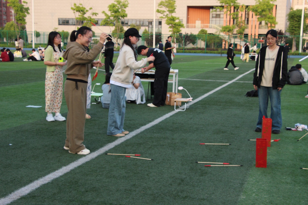 从夜市区域走出,精心装扮的休闲区和游戏区便映入眼帘。足球门和操场围墙上星光点点的装饰分外夺目,欢乐有趣的游戏项目趣味纷呈。在工作人员的引导下,同学们积极参与“投壶”“拔河”“你画我猜”“接龙”等集趣味性与协作性于一体的挑战,掌声与欢笑声此起彼伏。大家在漫步中感受校园魅力,在游戏中体悟团结力量,在互动中收获美好情谊。