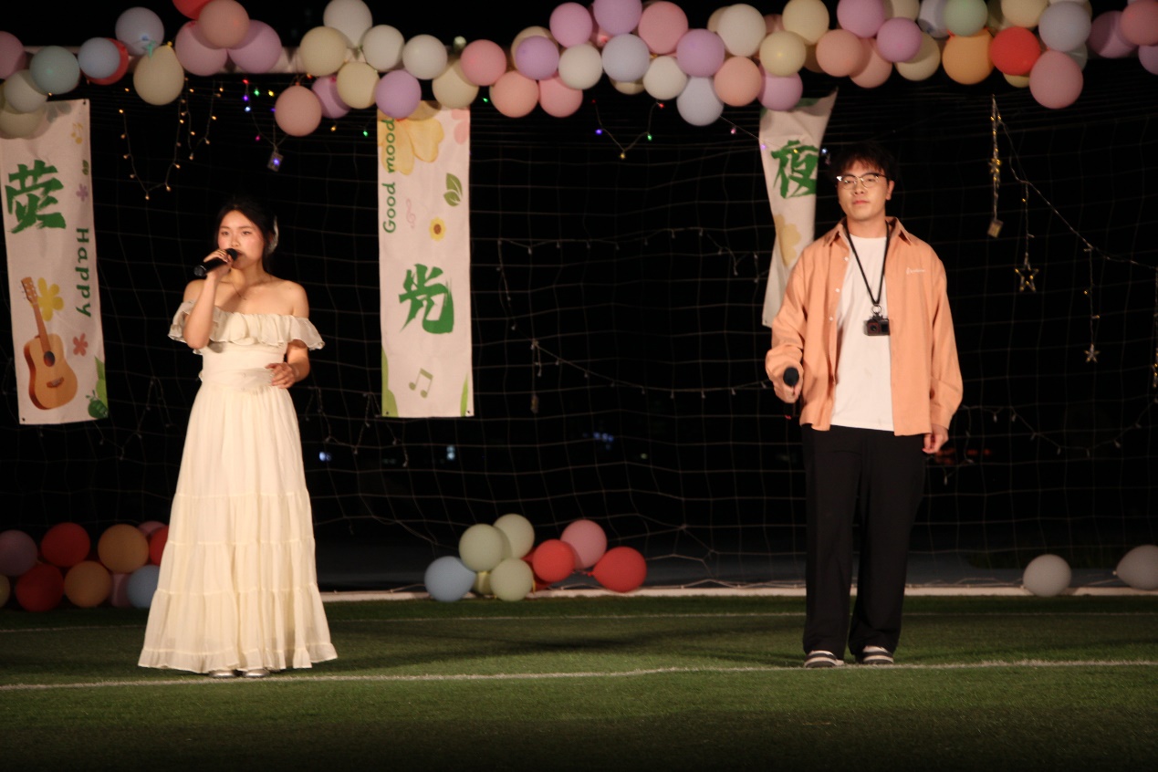 华灯初上,夜幕渐深,国际工程师学院的操场上却愈发热力全开。表演环节在激情洋溢的乐队演出中拉开帷幕,紧随其后的是校大学生艺术教育中心舞蹈团、爱乐社以及机械与汽车工程学院文艺团轮番登台献演,精彩不断的节目把现场气氛推向了一个又一个高潮。台上全情投入,台下热情应援。同学们手持荧光棒与手机灯,跟着节奏尽情挥舞,点点星光连成一片梦幻的“荧光海洋”。别具一格的中场互动环节更是点燃了全场笑点,掌声与尖叫不绝于耳,草地音乐节持续升温,青春与艺术在这一刻完美共鸣。